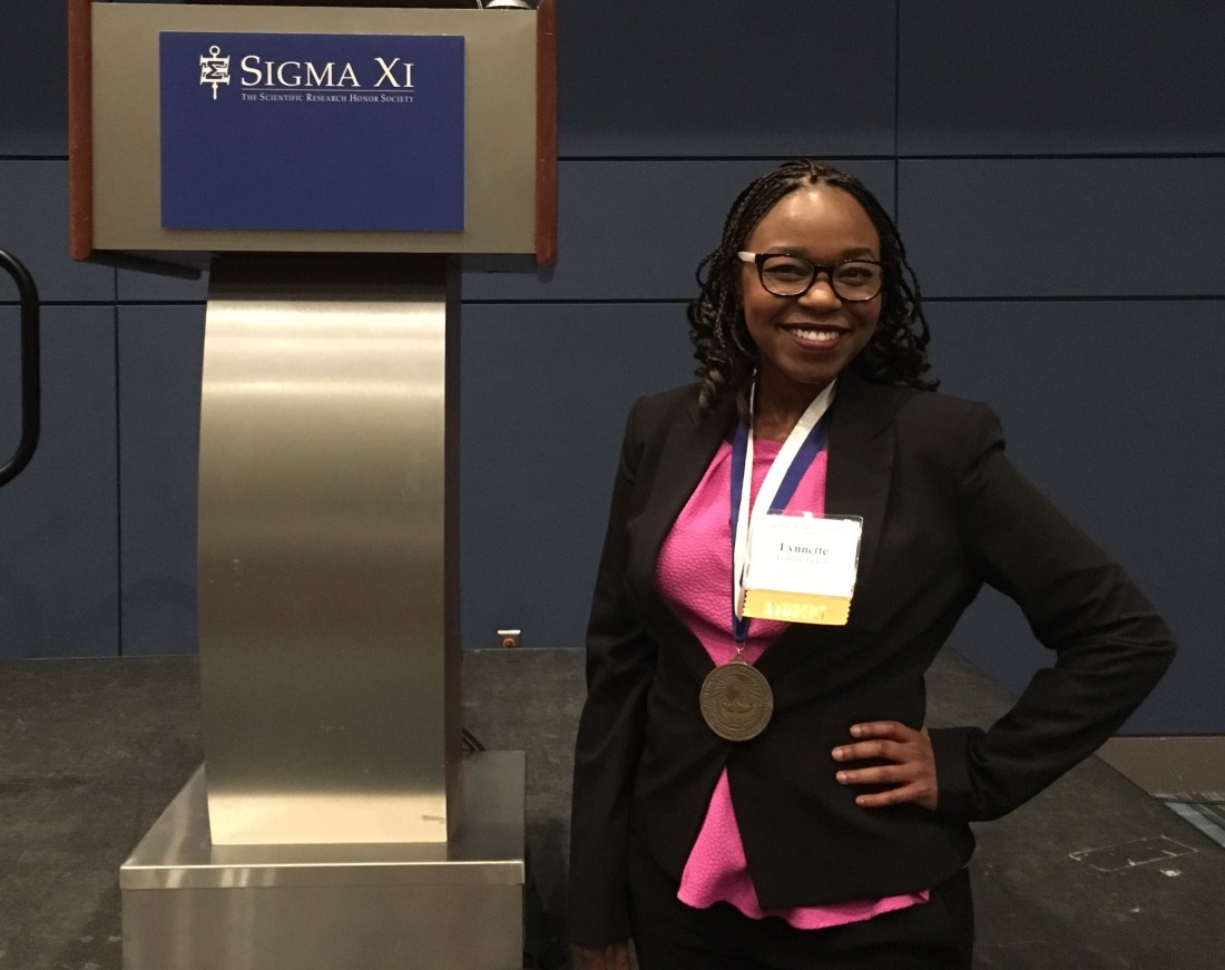 She won an award in the poster presentation competition under the Cell Biology & Biochemistry category. Lynnette received a medal, $150, and was inducted as an Associate member of Sigma Xi Scientific Research Honor Society.